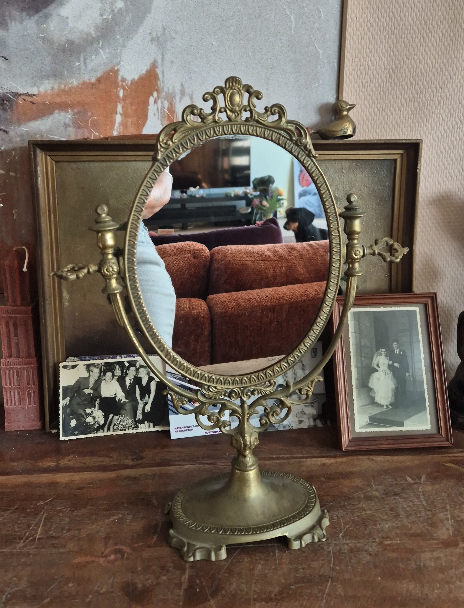 Oké, picture this: een make-up / kaptafel spiegel die niet alleen super praktisch is, maar ook je interieur een serieuze upgrade geeft. Dit gouden messing pareltje heeft die perfecte vintage look, met een classy design dat je niet overal tegenkomt. Of je nu je make-up flawless wilt aanbrengen of je haar checkt voordat je de deur uitgaat.
